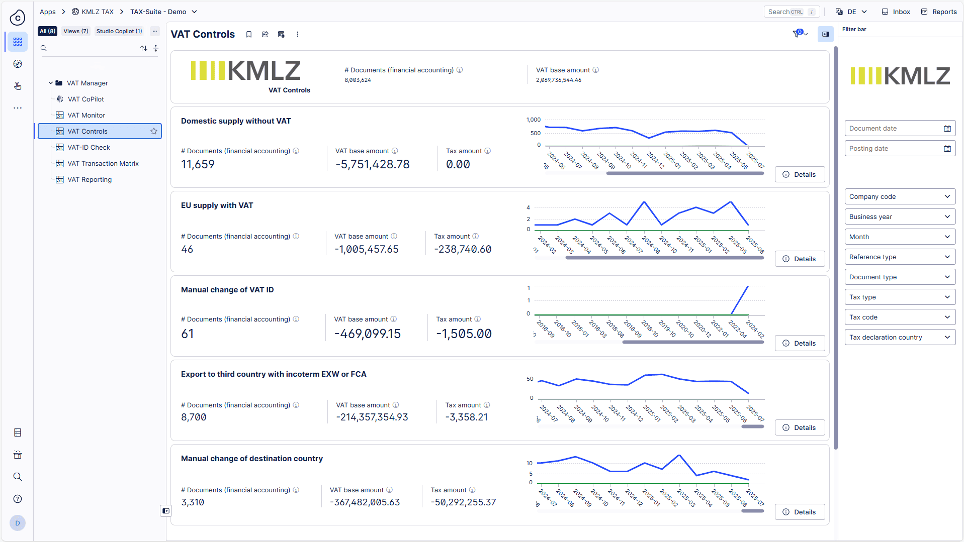 The VAT Manager within the TAX Suite provides a continuous tax control system for assessing and monitoring VAT transactions in ERP systems. It helps users identify potential risks and errors before they occur. The VAT Manager of the TAX Suite consists of the following modules: