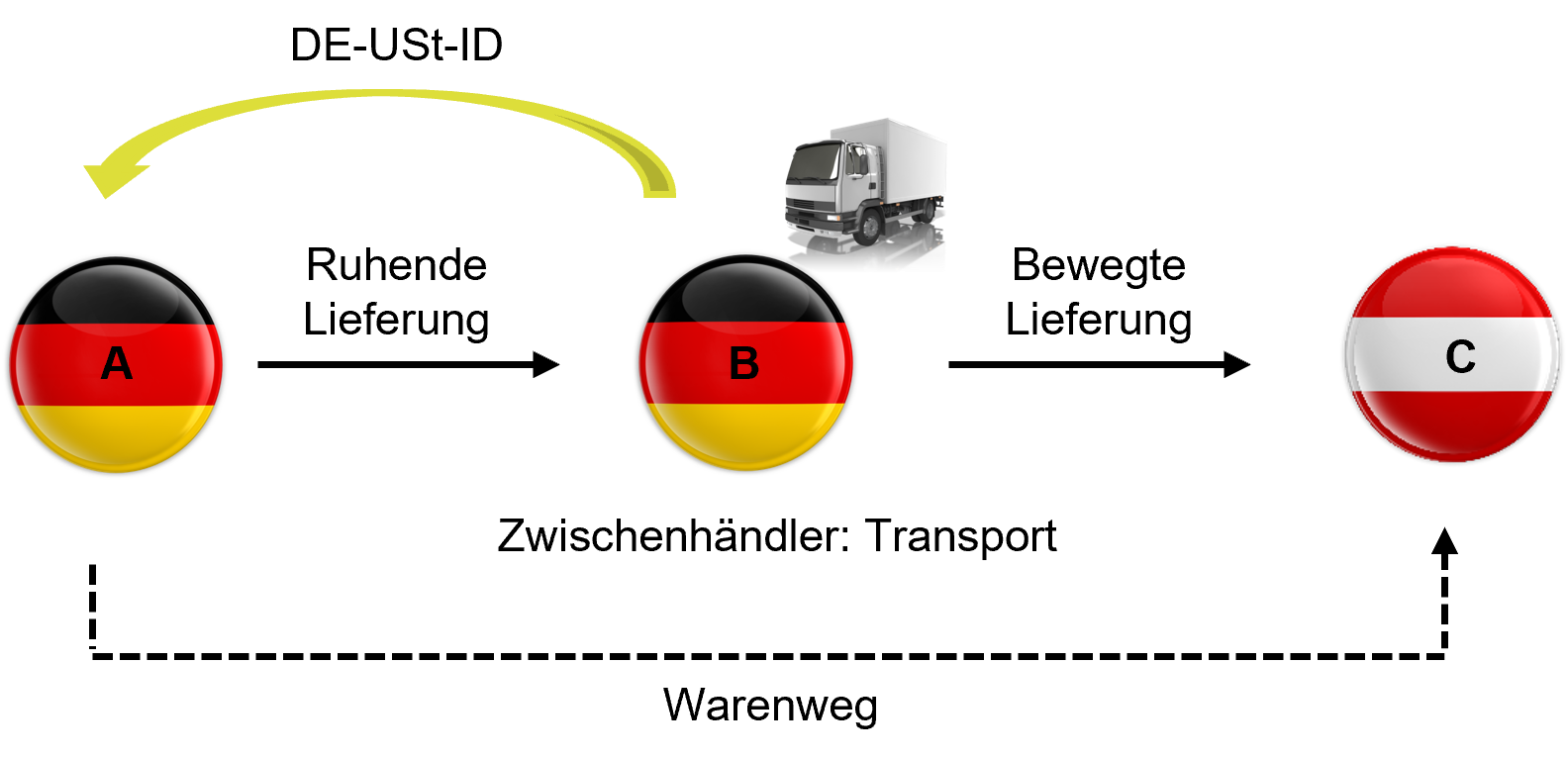 § 25b UStG enthält eine Vereinfachungsregelung dahingehend, dass eine steuerliche Registrierung des mittleren Unternehmers im Bestimmungsland vermieden wird. Bei einem innergemeinschaftlichem Dreiecksgeschäft werden unter Berücksichtigung der allgemeinen Regelungen für Reihengeschäfte grundsätzlich folgende Umsätze ausgeführt: