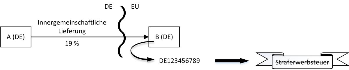 Der innergemeinschaftliche Erwerb gilt nach § 3d Satz 1 UStG (Art. 40 MwStSystRL) als an dem Ort bewirkt, wo der Transport endet. Dort entsteht dann Erwerbsteuer (in der Regel ohne Zahllast wegen Vorsteuerabzugs). Wenn der Erwerber ggü. dem Lieferer nicht seine USt-IdNr. des Bestimmungslandes verwendet, sondern eine ihm von einem anderen Mitgliedstaat zugeteilte USt-IdNr., ergibt sich aufgrund § 3d Satz 2 UStG (Art. 41 MwStSystRL) eine weitere Erwerbsteuer (sofern kein Dreiecksgeschäft vorliegt). Da diese nicht als Vorsteuer abgezogen werden darf, muss der Erwerber in dem Mitgliedstaat, aus dem die „falsch“ verwendete USt-IdNr. stammt, tatsächlich auch Erwerbsteuer zahlen, bis er nachweist, dass der Erwerb vorschriftsmäßig im Bestimmungsland besteuert wurde.
