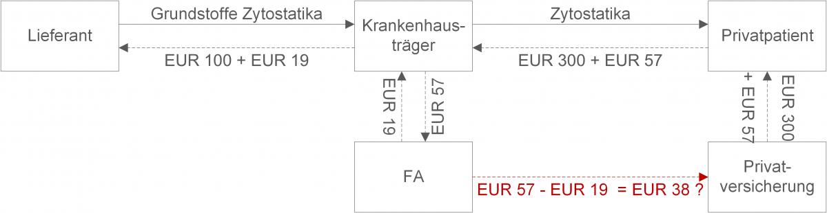 Im Rahmen ambulanter Krankenhausbehandlungen erhalten privatversicherte Krebspatienten von Krankenhausapotheken (unselbstständiger Teil des Krankenhausträgers) patientenindividuell hergestellte Zytostatika. In den Rechnungen hat das jeweilige Krankenhaus in den Jahren 2012 und 2013 Umsatzsteuer entweder offen ausgewiesen oder sie in den Preis einkalkuliert. Das Krankenhaus führte die Umsatzsteuer ab und machte Vorsteuerabzug aus den Eingangs-leistungen für die Zytostatika geltend. Die Privatversicherung hat dem Patienten dessen Ausgaben vollständig erstattet.
