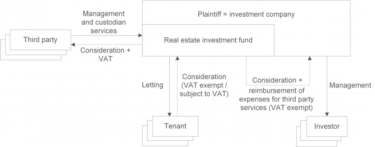 The Plaintiff was an investment company within the meaning of the Investment Act (applicable in 2006). As such, the Plaintiff set up and managed various real estate investment funds. For this purpose, the Plaintiff collected money from investors and used this money to purchase real estate which it then rented out, partly VAT exempt and party subject to VAT. The properties were owned by the Plaintiff but were each part of a real estate investment fund established by the Plaintiff. The Plaintiff thus acquired and managed the real estate for the joint account of the fund’s investors. The Plaintiff received a fee for the managing activities it provided to the investors, which it charged to the investment fund and which it considered as being VAT exempt.