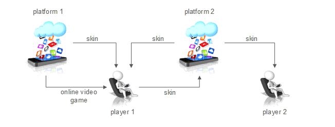 In the example, player 1 plays an online video game on platform 1 and purchases skins there. He then purchases more skins on platform 2. He first uses the purchased skins in the online video game on platform 1 and then sells them to player 2 on platform 2 with a profit margin.